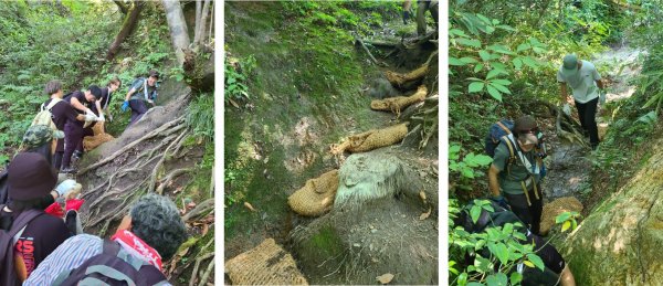 この山護運動は、三朝町にある国宝「三徳山三佛寺投入堂」までの行者道を、麻袋に土を詰めた土のうで修繕していく活動です。大山プロガイド協会の方に、”自然の植生に悪影響をおよぼさないよう、修繕箇所に使用できるのは敷地内の土のみであること“や”安全に補修や登山を行うための秘訣“などを教えていただきながら、みんなで力を合わせて作業を行い、このような活動があるからこそ、多くの人の安全や国宝が守られているということを、体験をとおして感じることができました。
